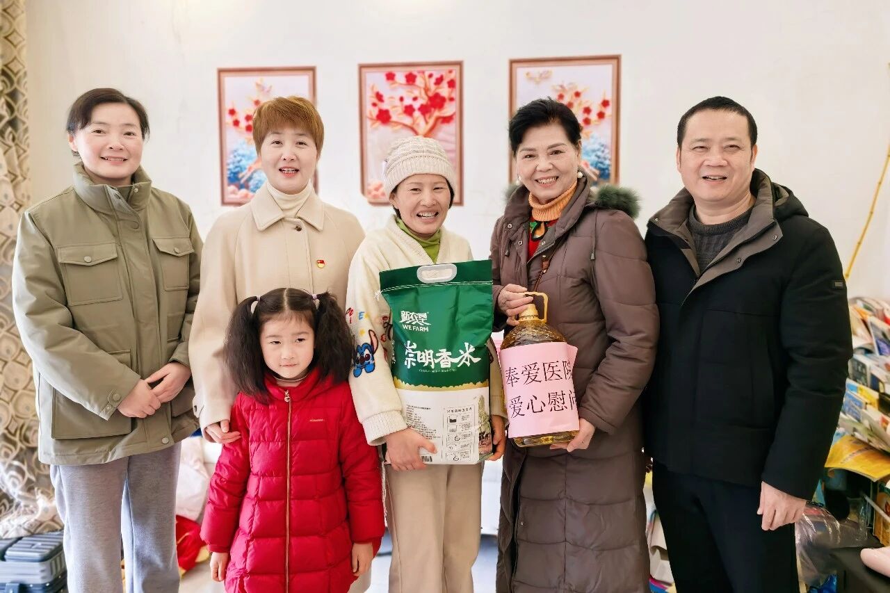 此次慰问活动由上海奉爱医院院长陶培丽(左起第二位)、工会主席詹主任(右起第一位),奉城镇第六居委会张书记(左起第一位),俏霞韵艺术团李致霞(右起第二位)带队,一行人带着精心筹备的慰问物资与诚挚的新春祝福,先后走访慰问了辖区5户困难家庭,与他们面对面交流、心贴心沟通,详细询问家庭生活近况、身体状况及实际困难,倾听他们的心声与诉求,为他们送去冬日里的关怀与慰藉。