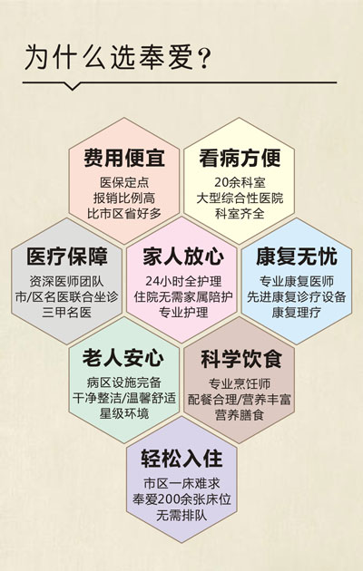 上海奉爱医院老年护理收住对象:患有各种常见病需要住院治疗或者各种手术术后需要治疗康复的对象,如:老年痴呆(阿尔茨海默症)、高血压、中风偏瘫、糖尿病、褥疮、心脑血管疾病、骨折、手术后、工伤后康复功能训练、高冷、独居、体弱多病、家庭无人照料的老人等。(患有精神失常、狂躁性疾病、传染病等患者谢绝收住。)